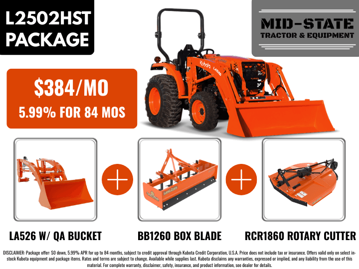 Package offer: $0 down, 5.99% APR for up to 84 months, subject to credit approval through Kubota Credit Corporation, U.S.A. Price does not include tax or insurance. Offers valid only on select in-stock Kubota equipment and package items. Rates and terms are subject to change. Available while supplies last. Kubota disclaims any warranties, expressed or implied, and any liability from the use of this material. For complete warranty, disclaimer, safety, insurance, and product information, see dealer for details.